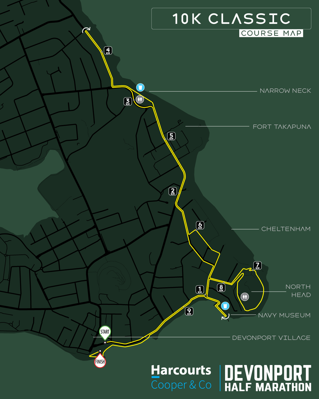 The 10k Classic course is a spectacular tour of the eastern side of the Devonport peninsula which takes in landmark such as Narrow Neck beach, the Torpedo Bay Navy Museum, the Devonport foreshore and the spectacular views from North Head. The course is a mix of closed road running, footpaths, some trail paths through North Head and the shell path on the Devonport seawall. Terrain is mostly flat with a bump on Vauxhall Rd and a gentle rise to the turnaround point plus the more challenging climb up North Head (but, oh, those views!).