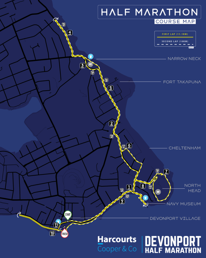 The 21.1km half marathon course comprises two full laps of the 10km course with a 1.1km out-and-back section between laps. The course is scenic and challenging. Held on mostly closed roads with some sections of pavement and grass track. The Half Marathon course begins on fully closed King Edward Parade and follows the exact path later used by the 10k race - out to the turnaround north of Narrow Neck Beach then back via Cheltenham, North Head and the Navy Museum. After completing your first lap, you'll continue past the race site (extra cheers thrown in for free!) and out on the shell path along the seawall to the navy base. Drink in the city skyline and then turn at the boat sheds and return to the race site (more cheers!) before looping back onto the course for your second lap. This extra 1.1km means that as you complete your second lap, you'll turn directly into Windsor Reserve and make your glorious finish.