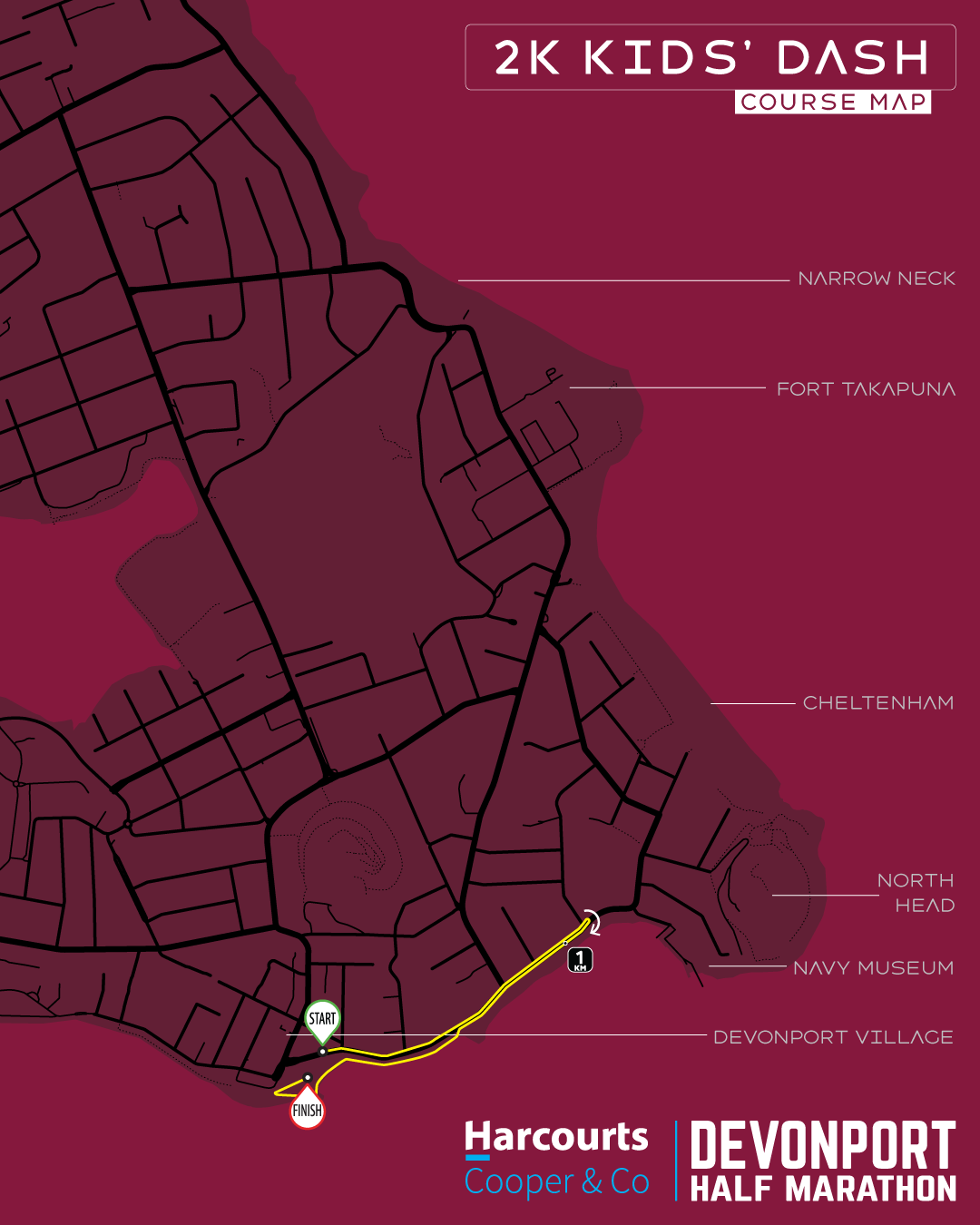 The kid's course takes places entirely within the road closure area on King Edward Parade. Starting under the same massive start arch as the adults, our future Olympians will charge down King Edward Parade towards the navy museum. Just before halfway, they will do a 360 to head back the way they came. At the 3/4 mark they will bear off the road and onto the shell seawall path that takes them all the way around the east and south of Windsor Reserve before the glorious gallop down the finish line!