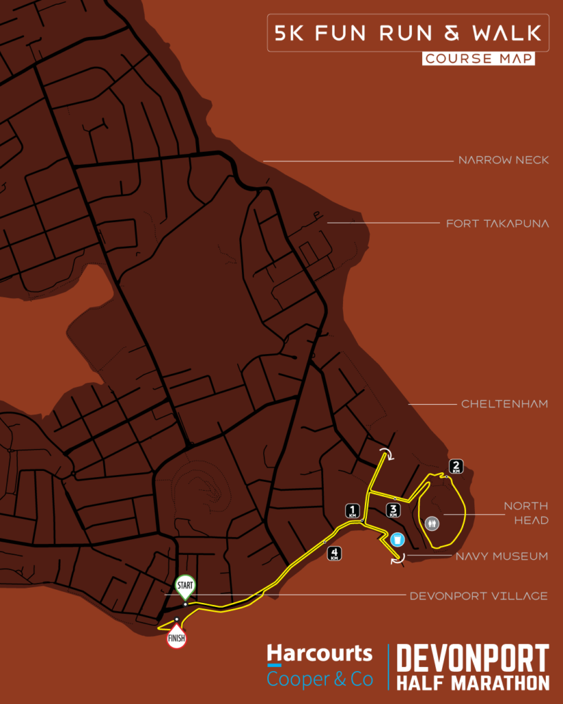 The 5k starts under the main arch in the heart of Devonport Village with the thrill of charging off right down the centre of closed-to-traffic King Edward Parade. After a brief excursion through the leafy, villa-lined streets of Cheltenham, it's time to take on the climb - and enjoy the views! - up and over North Head. You can light the afterburners on the way down from North Head before the turn into the Navy Museum at Torpedo Bay. Collect some welcome sustenance at the aid station and you now have a 1.5km flat dash into the finish line. Thriller!
