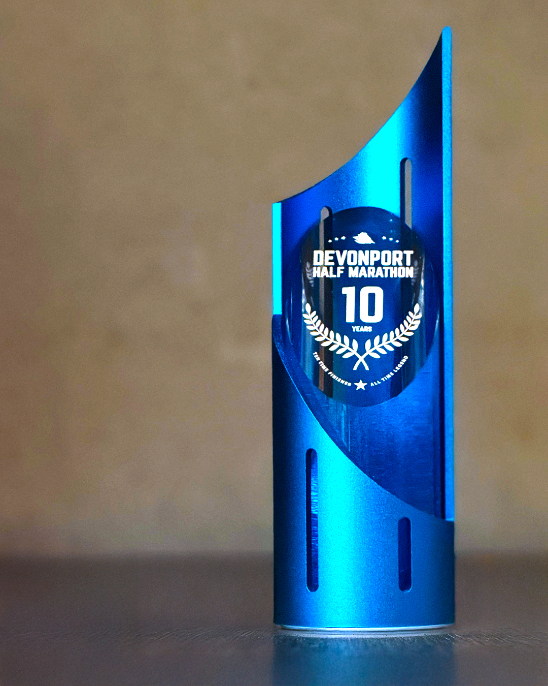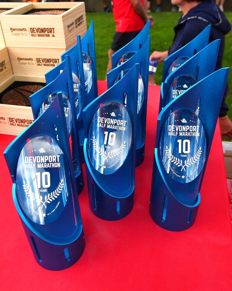 And if you do, we have something very special to give you in return. Every person who achieves a finish in ten Devonport Half Marathons will receive one of these beautiful crystal and metal 10 year finisher trophies and have their names recorded here for posterity.